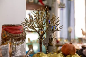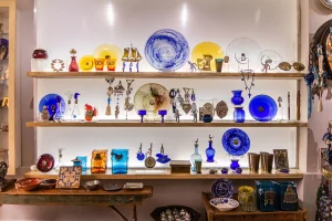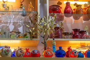 Διακοσμητικά και χρηστικά αντικείμενα φτιαγμένα από, φυσητό γυαλί σε πολλά χρώματα, δημιουργήματα από διάφορα μέταλλα, αλουμίνιο, μπρούτζο, φύλλο μπρούτζου κομμένο με λέιζερ.